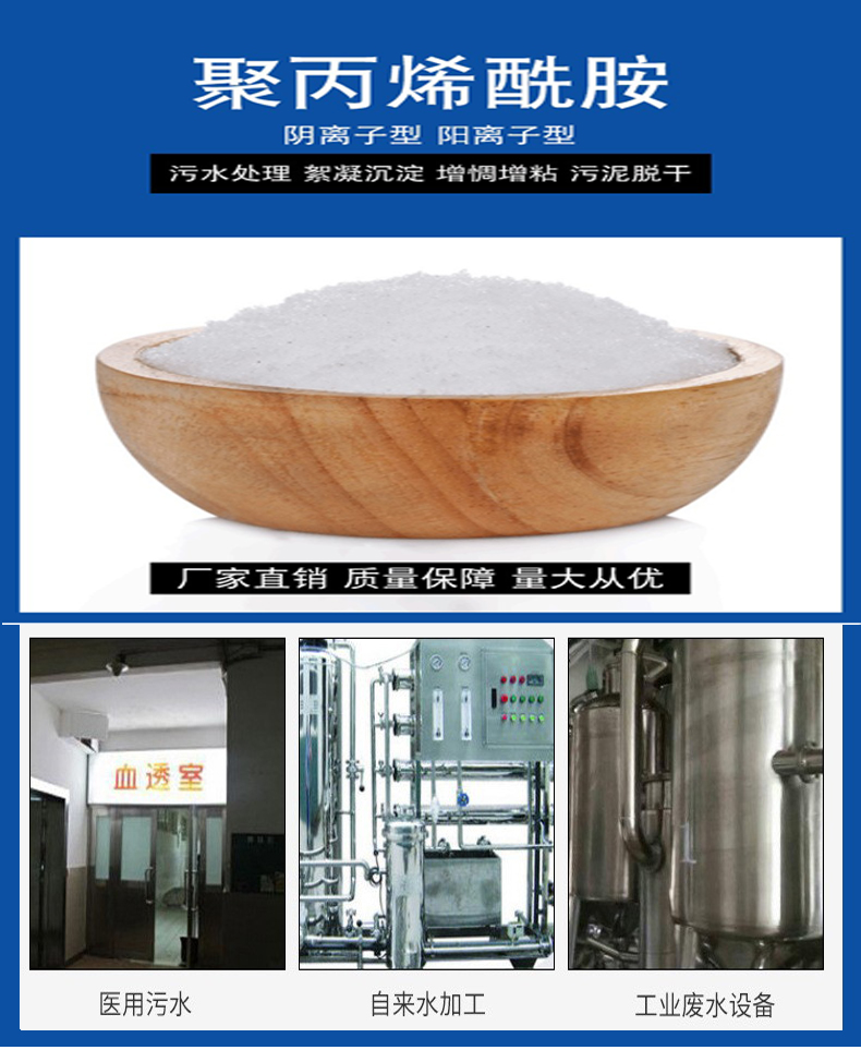 聚丙烯酰胺在石油開采 造紙 礦山  冶金 煤炭 高吸水樹脂 膠黏劑 皮革等行業(yè)使用范圍廣。鵬程聚丙烯酰胺城市污水 造紙 有色金屬冶煉,選礦 水務(wù) 油田化工 紡織印染 醫(yī)藥 皮革 食品等多領(lǐng)域。在選礦和洗砂過(guò)程中,礦粉和砂必須與其它雜質(zhì)分離,這是洗砂選用聚丙烯酰胺在脫水過(guò)程中參加用于沖砂的聚丙烯酰胺,懸浮液中的單個(gè)顆粒易于聚集,形成中骨料,敏捷沉降。為了洗砂廢水中達(dá)到良好的絮凝效果,應(yīng)該加入高分子洗砂陽(yáng)離子聚丙烯酰胺,加快絮凝。